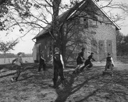 Ein weiteres Großereignis fand an dem Tag statt, an dem ich, etwa dreijährig, herausfinden wollte, ob Heu brennt. Das Versuchsmaterial war haufenweise auf dem Stallboden gelagert und als Winterfutter für das Vieh gedacht. Ich hatte nur die reine Wissenschaft und nichts Böses im Sinn und habe daher auch umsichtig ein kleines Häufchen Heu für meinen Versuch isoliert und siehe da, es brannte, sogar sehr gut, da strohtrocken. Dann habe ich es ausgetreten und wollte damit das Experiment beenden. Dabei stieg mir aber Rauch in die Augen, ich konnte nichts mehr sehen, bekam Panik und habe den Heuboden fluchtartig verlassen. Aus der Scheune stürzend begegnete mir Großmama. Ich wies nur panisch auf den Heuboden und rannte so schnell ich konnte weg. Durch die frühe Entdeckung des Brandes konnten alle Tiere gerettet werden. Ich verfolgte das feurige Schauspiel aus einem gegenüberliegenden Graben. Die Feuerwehr kam natürlich viel zu spät und um die Scheune herum hatte sich mittlerweile die halbe Gemeinde versammelt und fachsimpelte über das Gesehene. Einer von den Nachbarn entdeckte mich dann im Graben und führte mich meinen Großeltern zu. Hier hatte man grad andere Sorgen, dass mir nichts passiert war, wusste Großmama ja. Ich wurde also erst mal ohne Strafe in das Zimmer meiner abwesenden Tante Rose gesperrt. Später kam dann die Polizei, man ließ sich den Ablauf erklären und stockte dann bei dem Punkt, dass ein Dreijähriger die Scheune abgefackelt haben sollte, ein Versicherungsbetrug musste ausgeschlossen werden. Also wurde ich geholt. Ich hatte inzwischen den Lippenstift meiner Tante entdeckt und mir damit eine Indianerbemalung verpasst. Also meine Oma mich so sah, ist ihr dann doch der Geduldsfaden mit einem lauten Knall gerissen und ich bekam ordentlich was auf den Hintern (soweit ich mich erinnern kann, das erste und letzte Mal). Da kam ich dann verheult, verschmiert aber sonst guter Dinge in die Küche, wo ziemlich viele Leut‘ versammelt waren – neben unserer Familie und den Polizisten noch Versicherungsbeamte. Denen musste ich dann demonstrieren, wie ich an die „kindersicher“ im Schrank ganz oben versteckten Streichhölzer gekommen war – ein Kinderspiel, einfach Stuhl rangeschoben und schon hatte ich sie. Erwähnenswert ist noch dass in den folgenden Monaten in der Nachbarschaft noch zwei weitere Scheunen den Flammen zum Opfer fielen, auch sie wurden von kleinen Jungens in Brand gesteckt.
